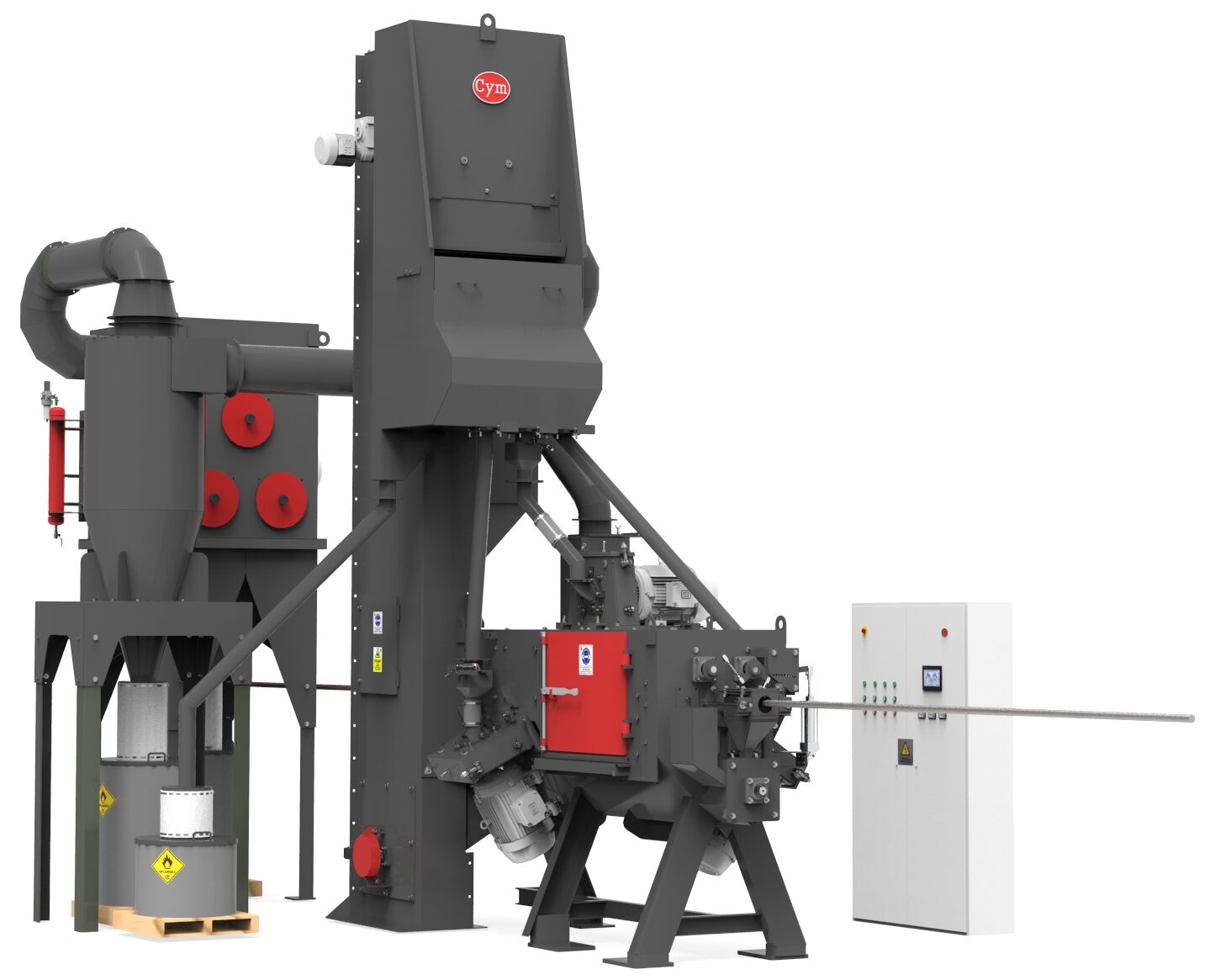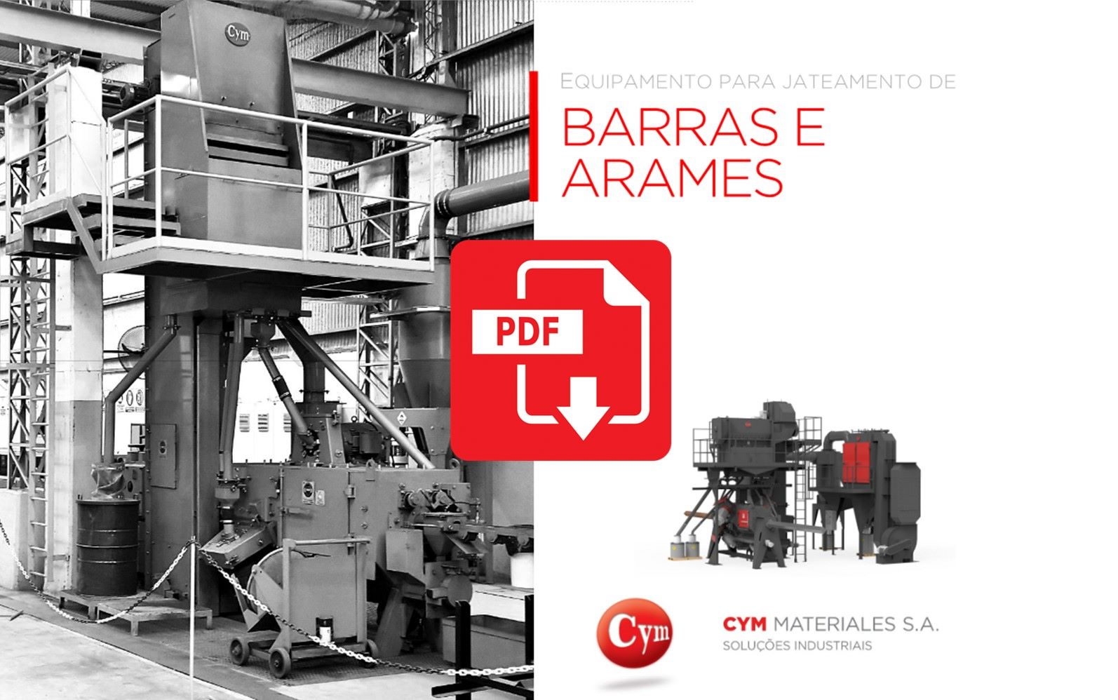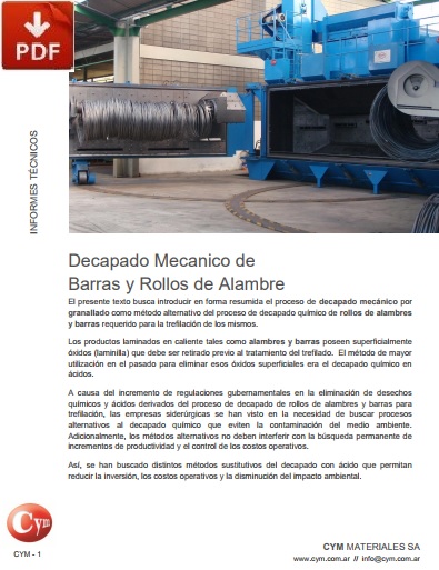 A METALCYM fabrica equipamentos de jateamento para decapagem mecânica ou desincrustação de arames  e barras em processos por lotes e processos contínuos  de passagem linear, permitindo selecionar o equipamento correto para cada aplicação assegurando uma alta produtividade com baixo custo operativo  sem contaminar  o meio Ambiente.