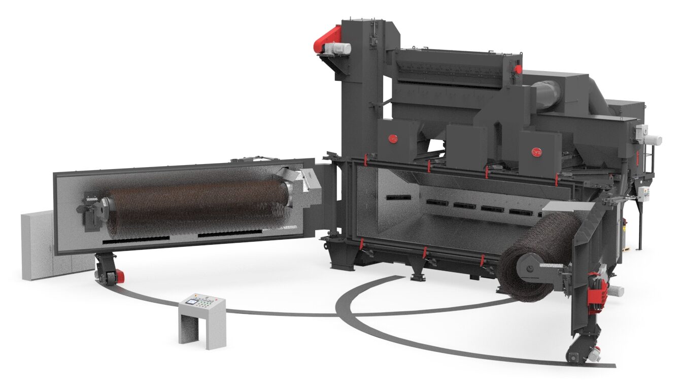 O equipamento de duas portas minimiza o tempo morto e otimiza o processo, permitindo o carregamento de um rolo enquanto o outro no interior do equipamento está sendo jateado.